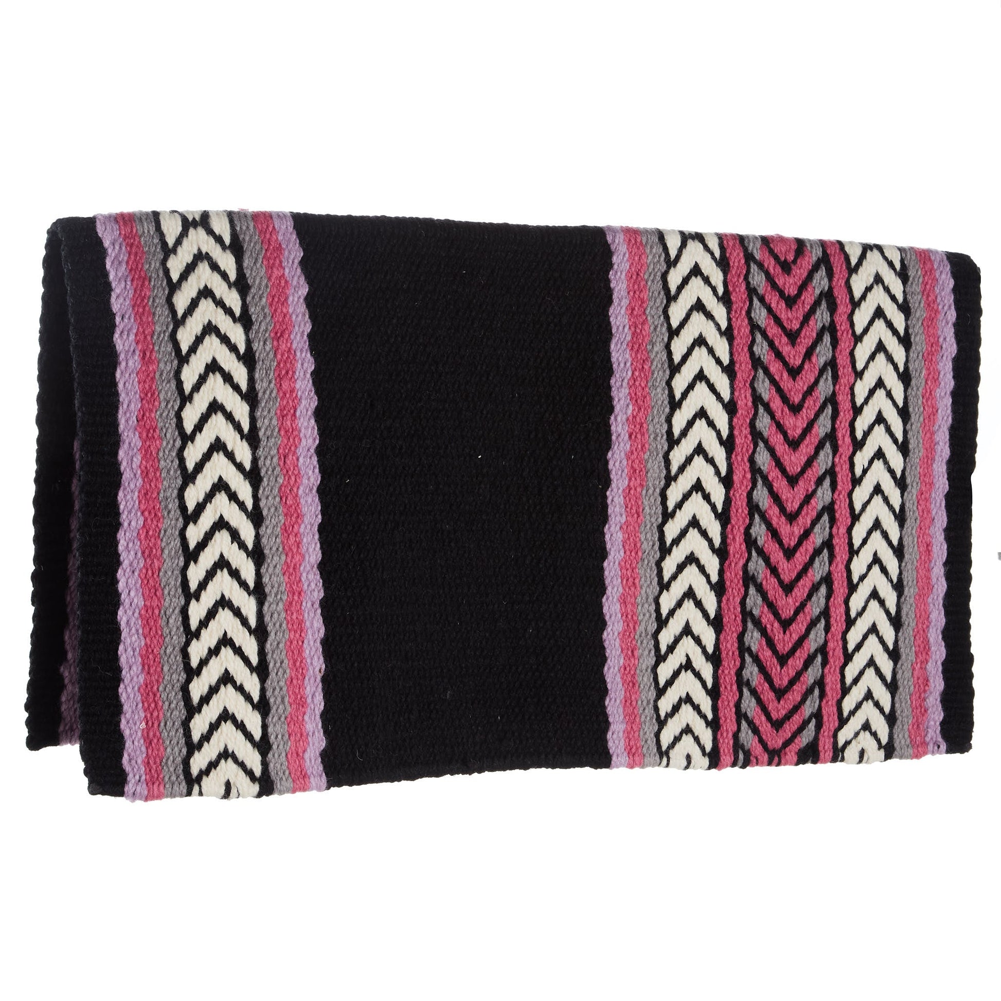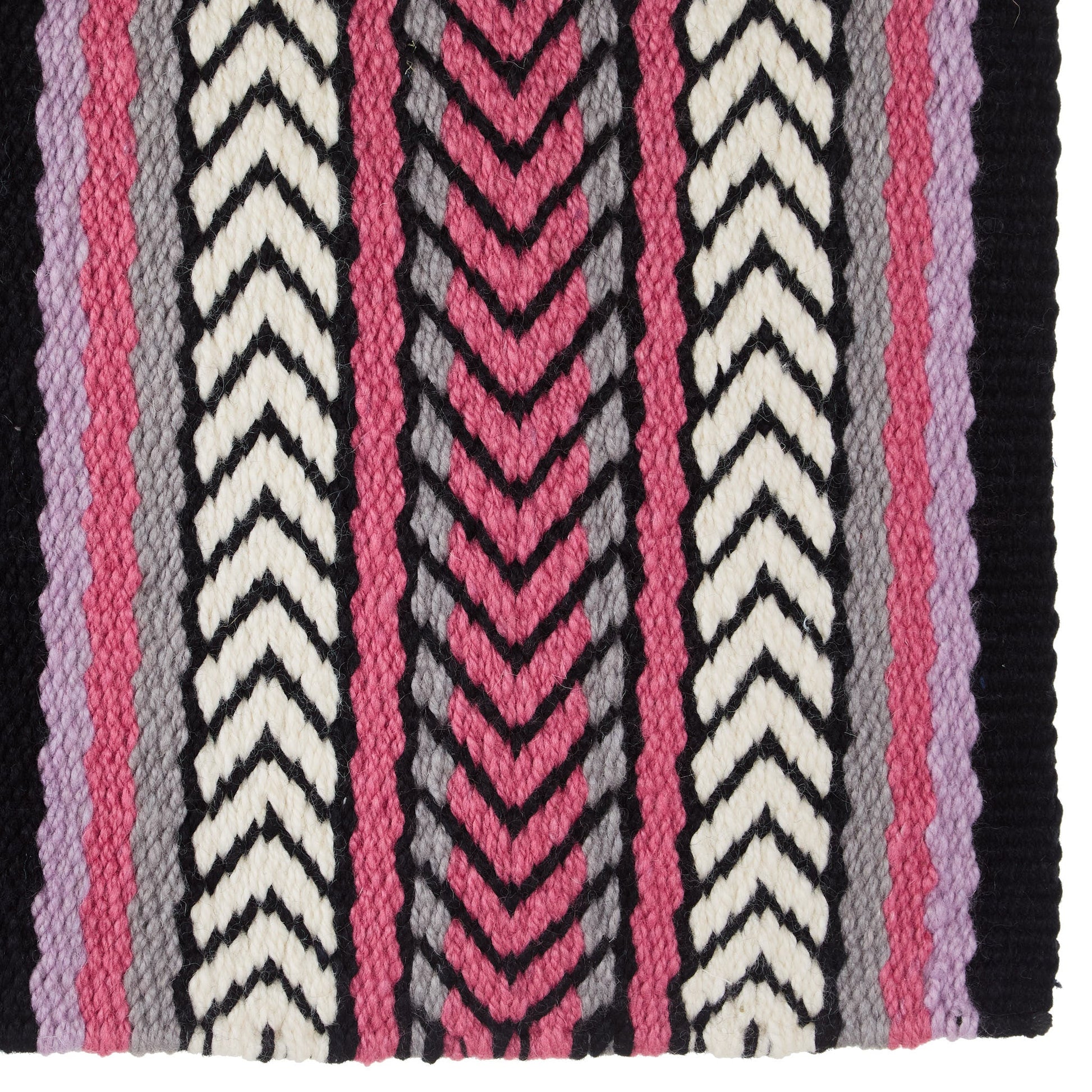 Introducing the latest addition to Mayatex's saddle blanket collection, the Iron Horse. The Iron Horse saddle blanket design features a unique, braided rope design that compliments any western horse rider! This exquisite piece is adorned with a sophisticated color palette of Black, Cream, Rapture Rose, Ash, and Lavender, adding a touch of elegance to your equestrian gear. Measuring 36" x 34", this saddle blanket is crafted from New Zealand Wool, ensuring a blend of luxurious comfort and durability. Its distinctive design, featuring rich and vibrant tones of Black, Cream, Rapture Rose, Ash, and Lavender, adds a timeless and stylish element to your riding ensemble. Product Number: 1425-5