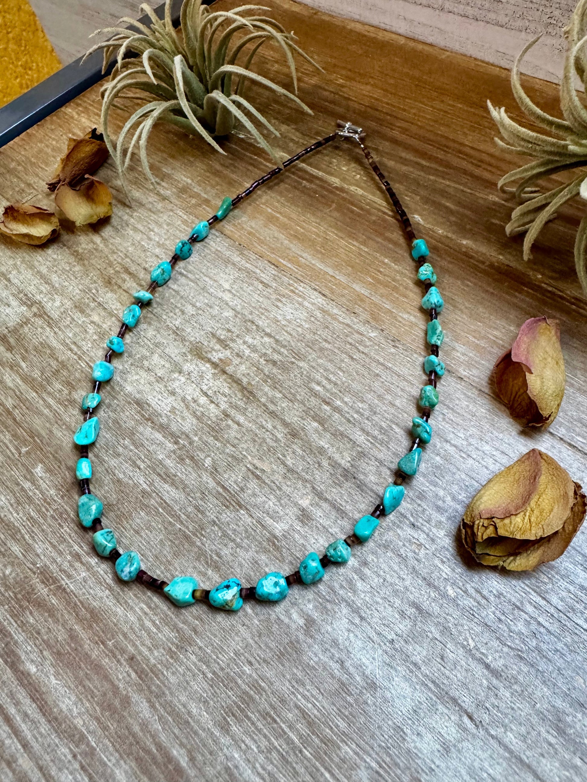 This vibrant 19-inch necklace features a stunning mix of turquoise and shell beads, each one unique in shape and color. The natural turquoise offers a bright pop of blue-green, paired with soft-toned shell beads for the perfect balance of earthy and coastal vibes. Every piece is one of a kind due to the nature of the stones used.