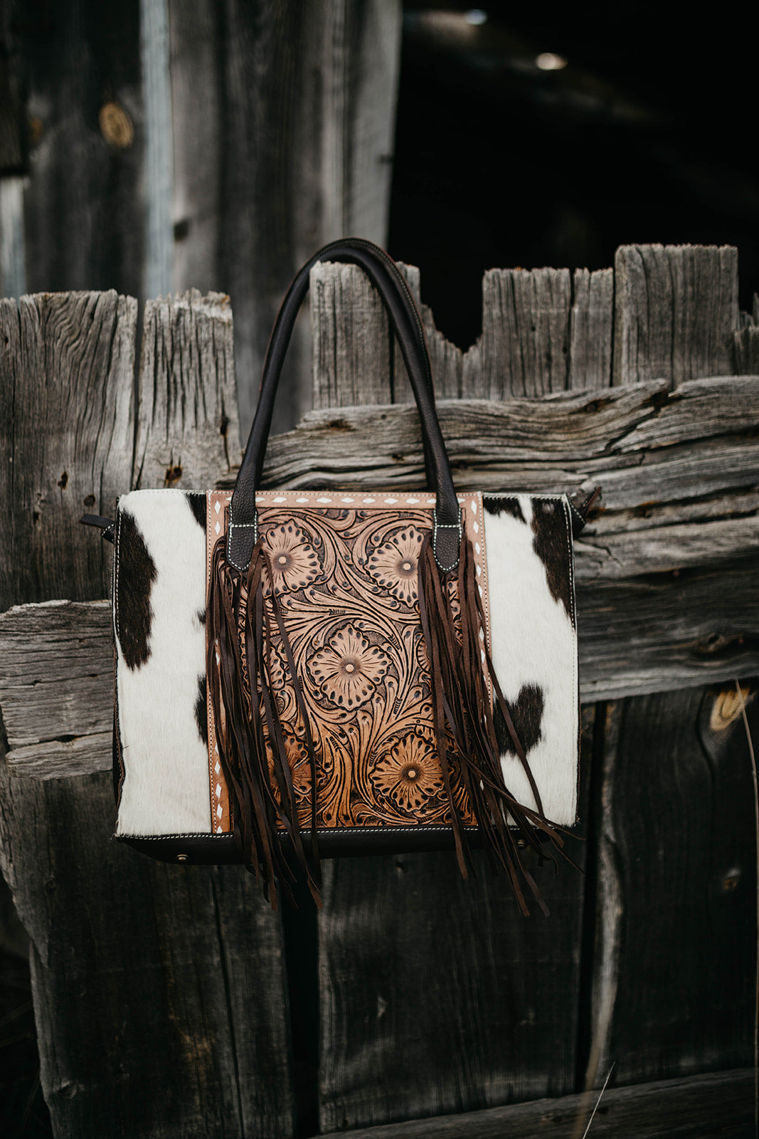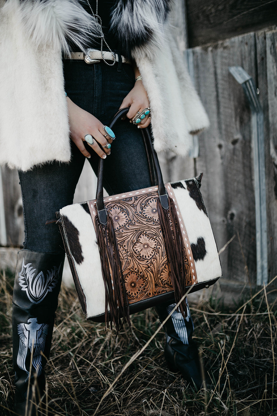 Due to the nature of genuine cowhide every purse will be one of a kind as each purse will be made with a unique cowhide piece. Branding logo may be light or dark brown.
