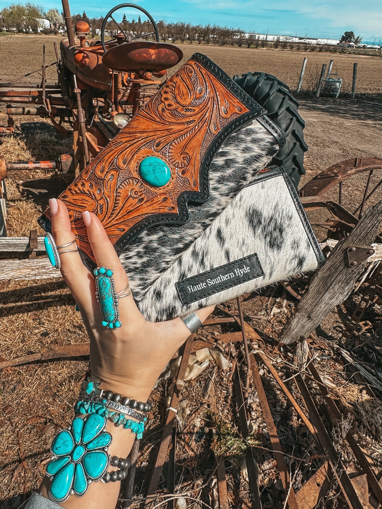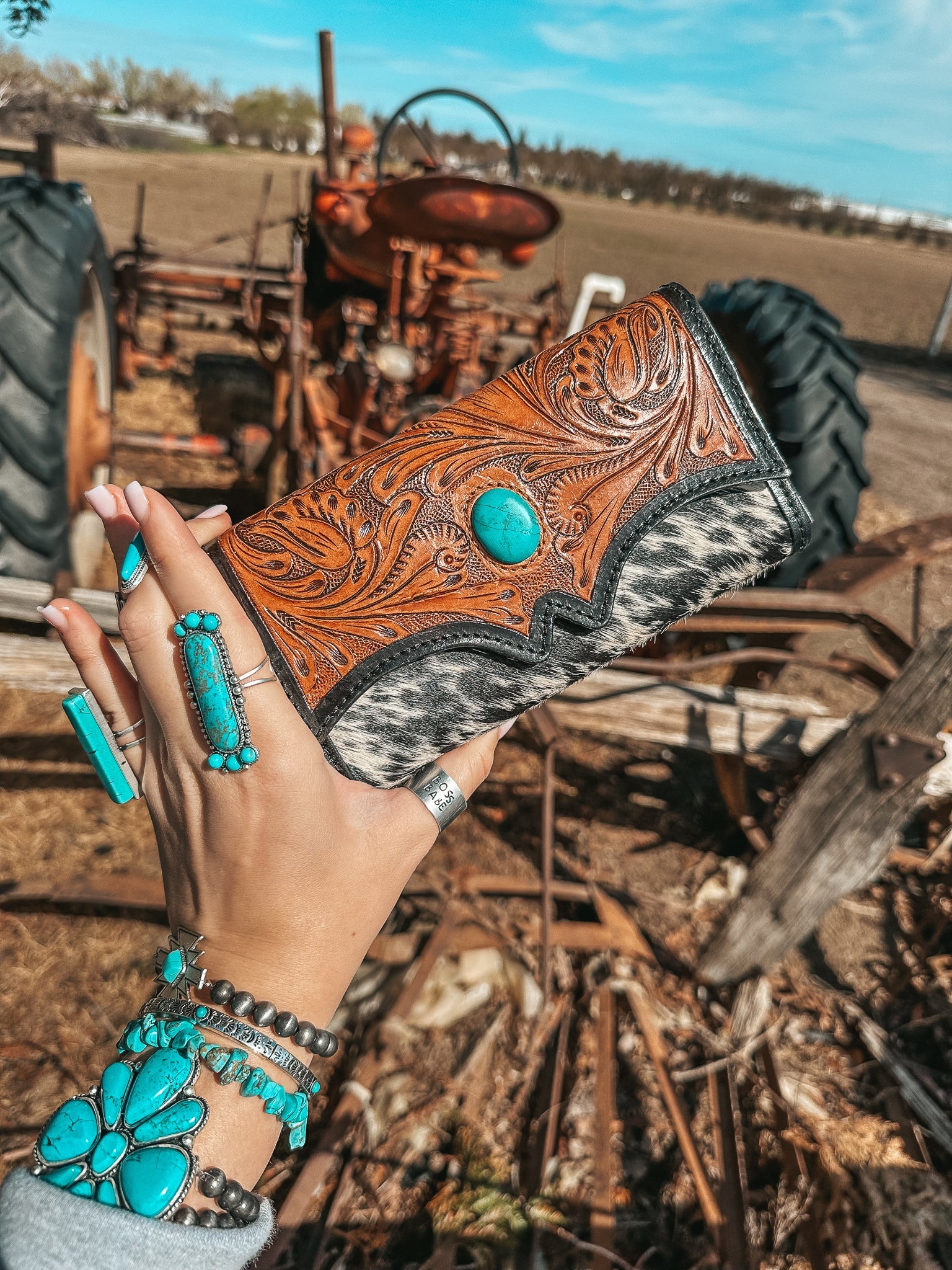 Luxury meets Western! My heart is spinning for these luxe wallets. This is the perfect date night grab. She features a beautiful tooled flap, with a genuine cowhide body. A cell phoe slot in the back provides quick phone access. The full leather interior contains 12 credit card slots, one change zipper pocket, and one extra back slot.