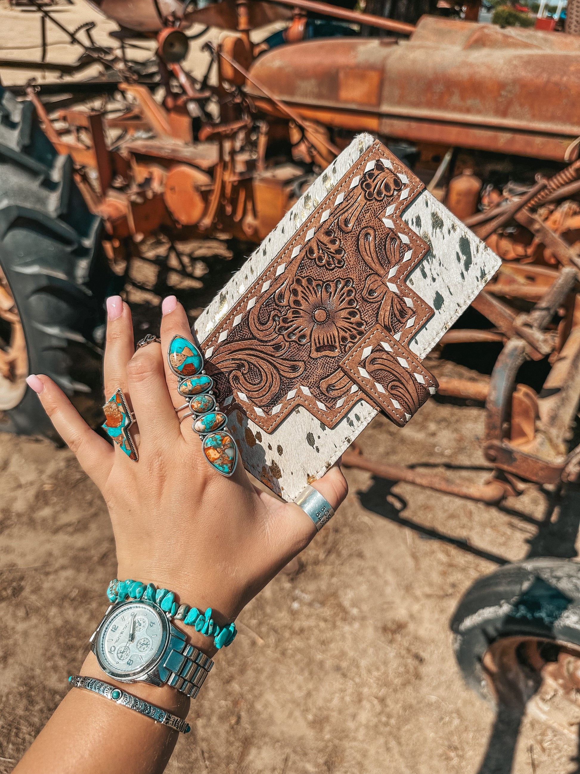 If you are looking for a wallet to match your White Hyde Gold Foiled Lancaster Purse , your Golden Hour, or Golden Babe Concealed Carry, this is it! She features matching tooling, genujne leather, and cowhide. This is a dream wallet!