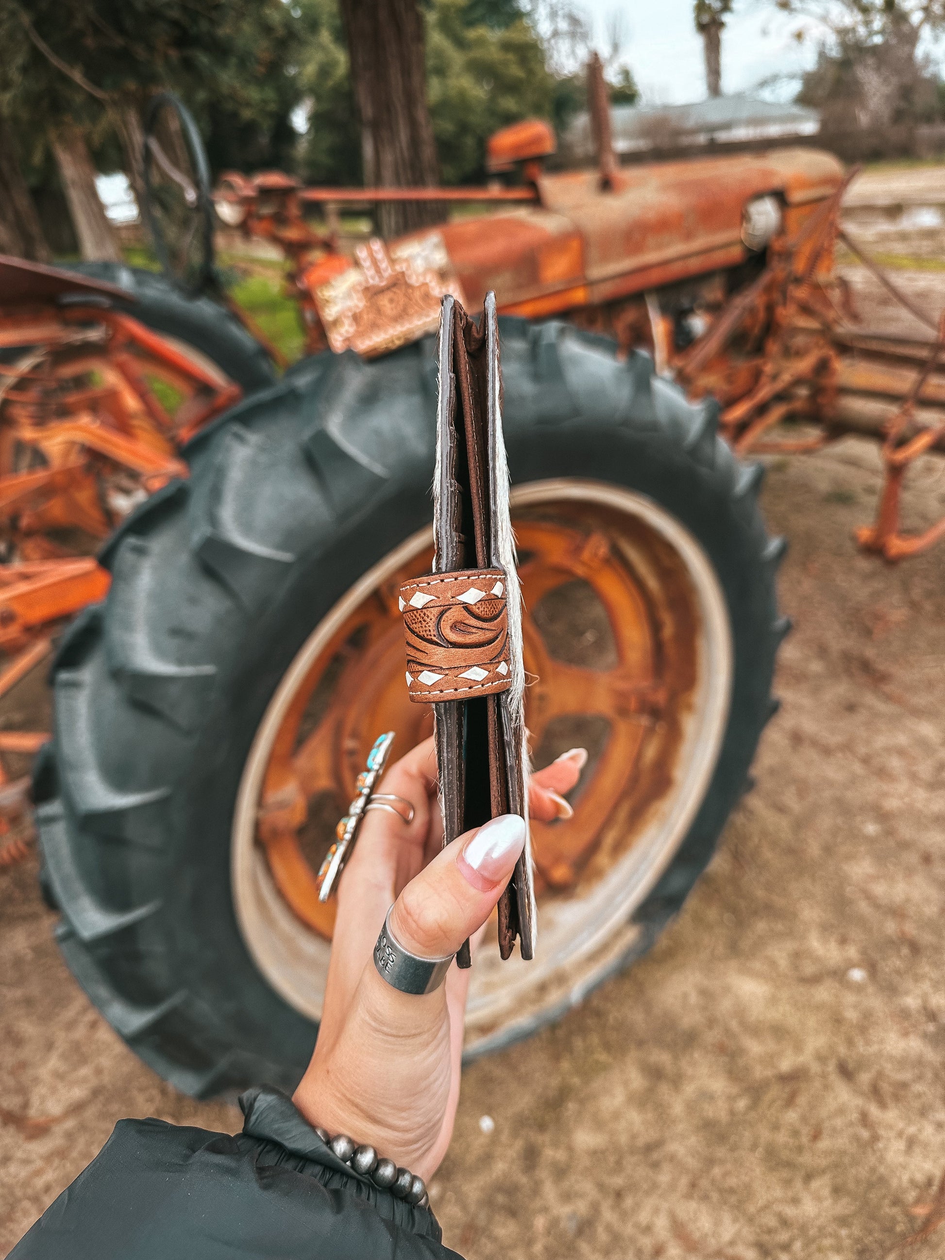 If you are looking for a wallet to match your White Hyde Gold Foiled Splattered Cowhide Lancaster Purse this is it! She features matching tooling, genuine leather, and cowhide. This is a dream wallet!